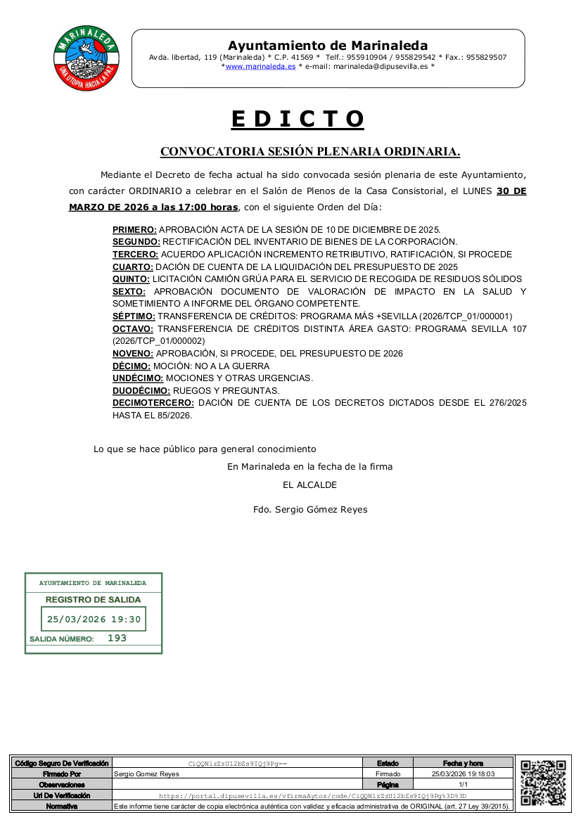 Mediante el Decreto de fecha actual ha sido convocada sesión plenaria de este Ayuntamiento, con carácter ORDINARIO a celebrar en el Salón de Plenos de la Casa Consistorial, el LUNES 30 DE MARZO DE 2026 a las 17:00 horas, con el siguiente Orden del Día: