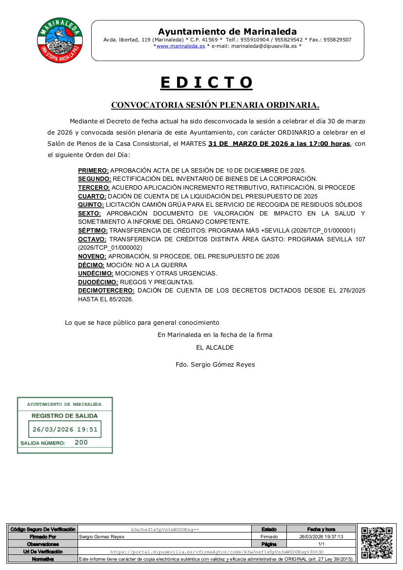 Mediante el Decreto de fecha actual ha sido convocada sesión plenaria de este Ayuntamiento, con carácter ORDINARIO a celebrar en el Salón de Plenos de la Casa Consistorial, el LUNES 31 DE MARZO DE 2026 a las 17:00 horas