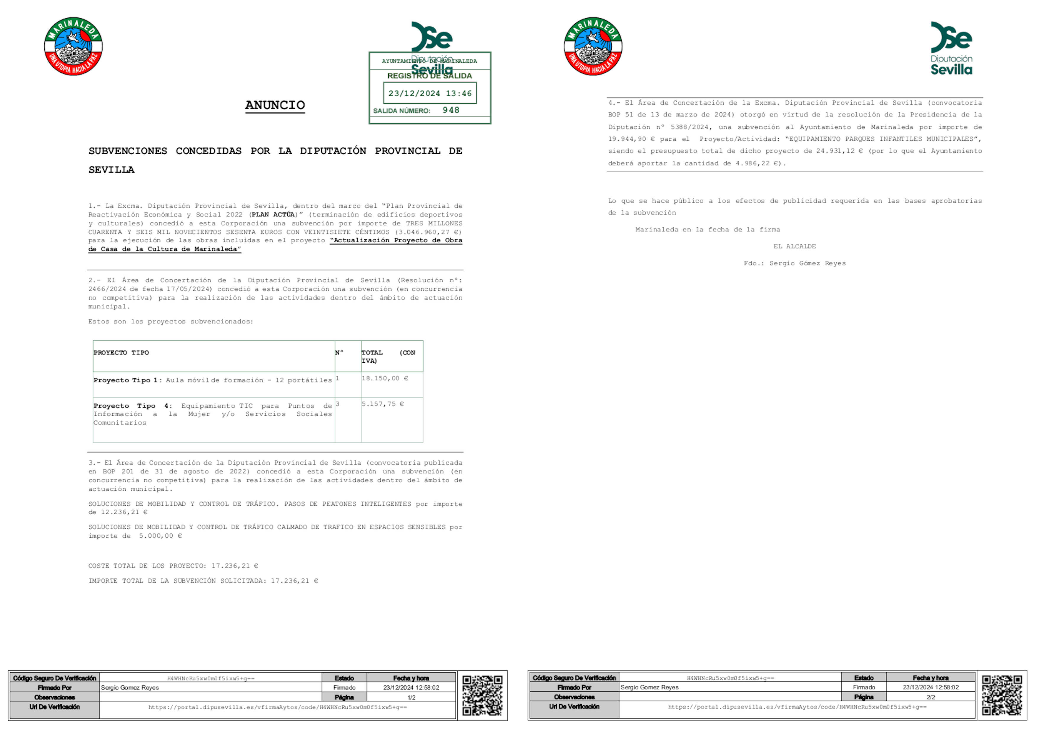 SUBVENCIONES CONCEDIDAS POR LA DIPUTACIÓN PROVINCIAL DE SEVILLA