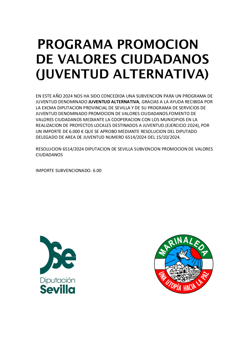 EN ESTE AÑO 2024 NOS HA SIDO CONCEDIDA UNA SUBVENCION PARA UN PROGRAMA DE JUVENTUD DENOMINADO JUVENTUD ALTERNATIVA, GRACIAS A LA AYUDA RECIBIDA POR LA EXCMA DIPUTACION PROVINCIAL DE SEVILLA Y DE SU PROGRAMA DE SERVICIOS DE JUVENTUD DENOMINADO PROMOCION DE VALORES CIUDADANOS.FOMENTO DE VALORES CIUDADANOS MEDIANTE LA COOPERACION CON LOS MUNICIPIOS EN LA REALIZACION DE PROYECTOS LOCALES DESTINADOS A JUVENTUD.(EJERCICIO 2024), POR UN IMPORTE DE 6.000 € QUE SE APROBO MEDIANTE RESOLUCION DEL DIPUTADO DELEGADO DE AREA DE JUVENTUD NUMERO 6514/2024 DEL 15/10/2024. RESOLUCION 6514/2024 DIPUTACION DE SEVILLA SUBVENCION PROMOCION DE VALORES CIUDADANOS IMPORTE SUBVENCIONADO. 6.00
