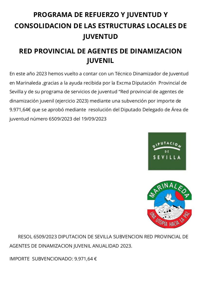En este año 2023 hemos vuelto a contar con un Técnico Dinamizador de Juventud en Marinaleda ,gracias a la ayuda recibida por la Excma Diputación Provincial de Sevilla y de su programa de servicios de juventud “Red provincial de agentes de dinamización juvenil (ejercicio 2023) mediante una subvención por importe de 9.971,64€ que se aprobó mediante resolución del Diputado Delegado de Área de juventud número 6509/2023 del 19/09/2023